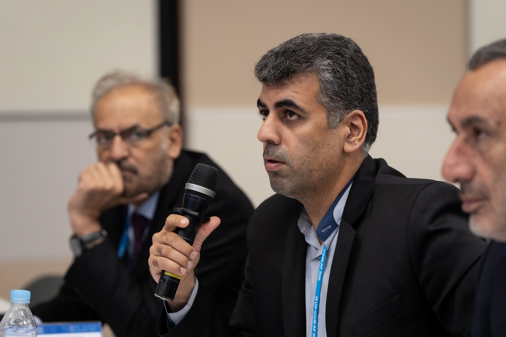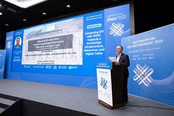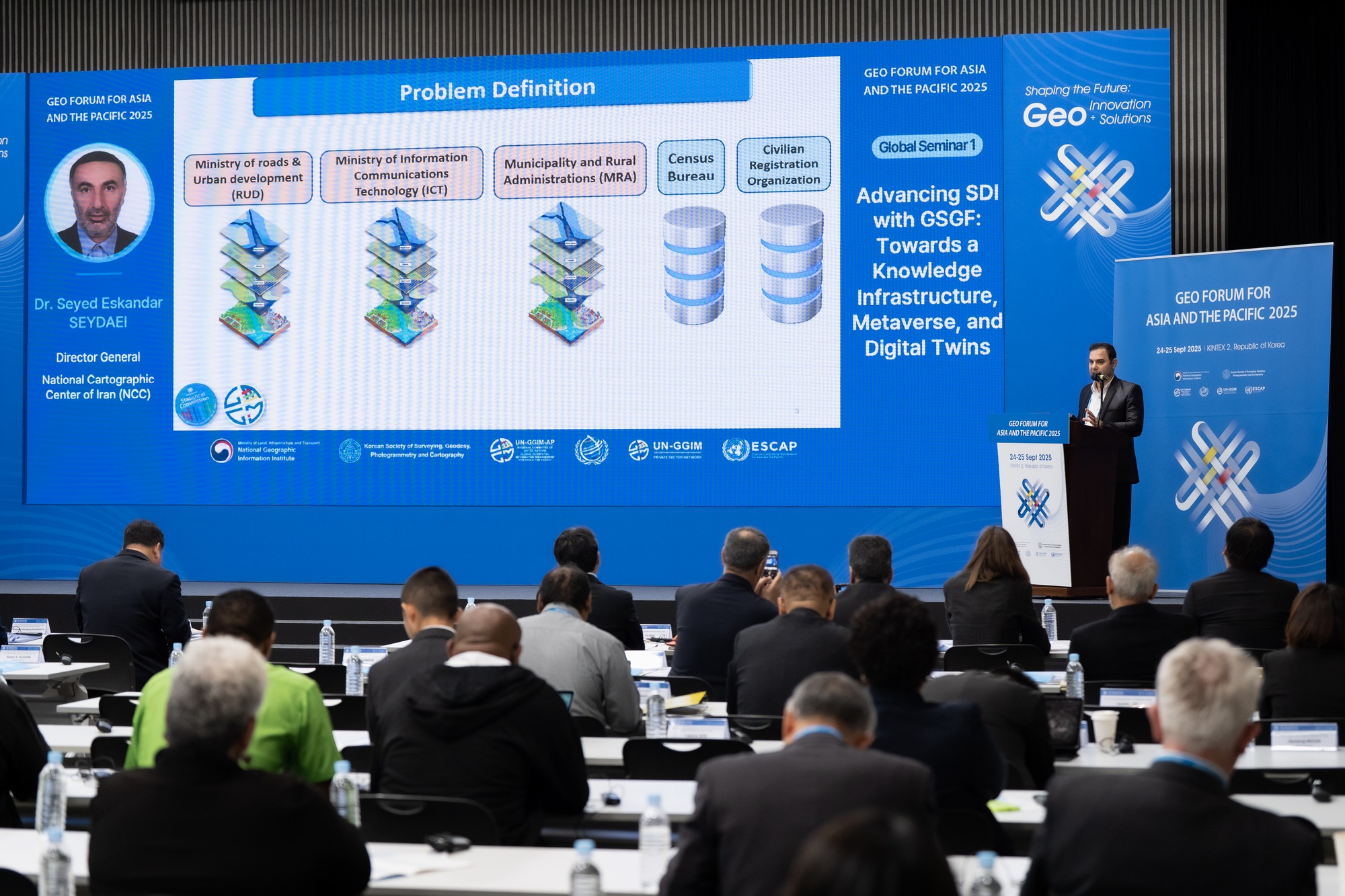 دکتر سید اسکندر صیدایی، رئیس سازمان نقشهبرداری به عنوان رئیس کارگروه ۳ در زمینه یکپارچهسازی اطلاعات مکانی و آمار (Integrating Geospatial Information and Statisticas)، بر تعهد ایران به پیشبرد یکپارچهسازی دادههای آماری و مکانی برای نظارت بر اهداف توسعه پایدار (SDGs) تأکید کرد. ایشان به قابلیتهای تخصصی، علمی و بهروز ایران در زمینه نقشهبرداری و اطلاعات مکانی در چارچوب UN-GGIM-AP اشاره کردند. مهندس علیرضا امیری، رئیس اداره راهبری سامانهها و پایگاههای داده مکانی سازمان، با ارائه سخنرانی با عنوان "پیشبرد SDI با GSGF: به سوی زیرساخت دانش، متاورس و همسان رقومی"، گامهای نوآورانه ایران در فناوریهای اطلاعات مکانی را به نمایش گذاشت. سخنرانی وی به فعالیتهای تخصصی انجام شده در زمینه پیادهسازی چارچوب آماری مکانی جهانی (GSGF) در سازمان نقشهبرداری از قبیل ایجاد گرید ملی، سرویسهای سهبعدی تحت وب، واقعیت مجازی و افزوده پرداخت و بر نقش آن در شکلدهی زیرساختهای دانش آینده، به ویژه در حوزههای نوظهور متاورس و همسان رقمی تأکید کرد. این ارائه، بیانگر رویکرد آیندهنگر ایران، در بکارگیری فناوریهای پیشرفته در مدیریت اطلاعات مکانی در راستای ایجاد زیرساختهای داده مکانی جامعتر و تعاملیتر بود. همچنین ایشان در سخنرانی دیگری، توضیحاتی در خصوص ارکان چارچوب اطلاعات مکانی یکپارچه که در ایران پیادهسازی شدهاند، ارائه نمود.