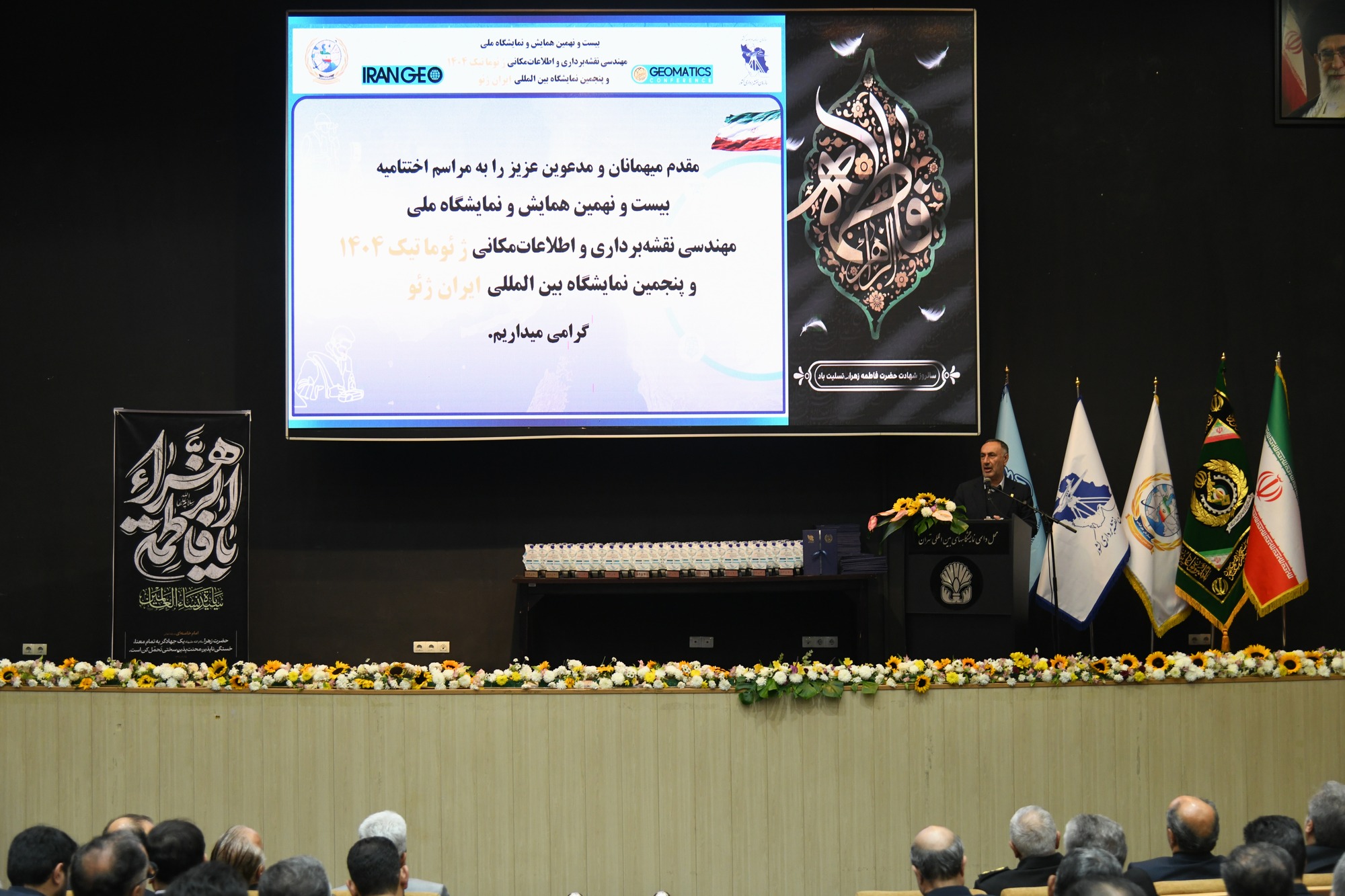 به گزارش روابط عمومی سازمان نقشه‌برداری کشور، مراسم اختتامیه «بیست و نهمین همایش و نمایشگاه ملی مهندسی نقشه‌برداری و اطلاعات مکانی(ژئوماتیک1404) و پنجمین نمایشگاه بین‌المللی ایران ژئو» با حضور دکتر سید اسکندر صیدایی، رئیس سازمان نقشه‌برداری کشور، امیر خواجه‌امیری، معاون هماهنگی و پشتیبانی وزارت دفاع و پشتیبانی نیروهای مسلح،  امیر فخری، رئیس سازمان جغرافیا نیروهای مسلح، جمعی از مدیران ارشد، اساتید دانشگاه، پیشکسوتان و علاقه‌مندان این حوزه، روز دوم آذرماه سال جاری در محل نمایشگاه بین المللی تهران برگزار شد. این مراسم که هم‌زمان با ایام شهادت حضرت فاطمه‌(س) برگزار شد، علاوه بر ایجاد فضای معنوی، فرصتی برای قدردانی از تلاش‌ها و مشارکت گسترده ملی در برگزاری یکی از بزرگ‌ترین رویدادهای علمی حوزه ژئوماتیک بود.